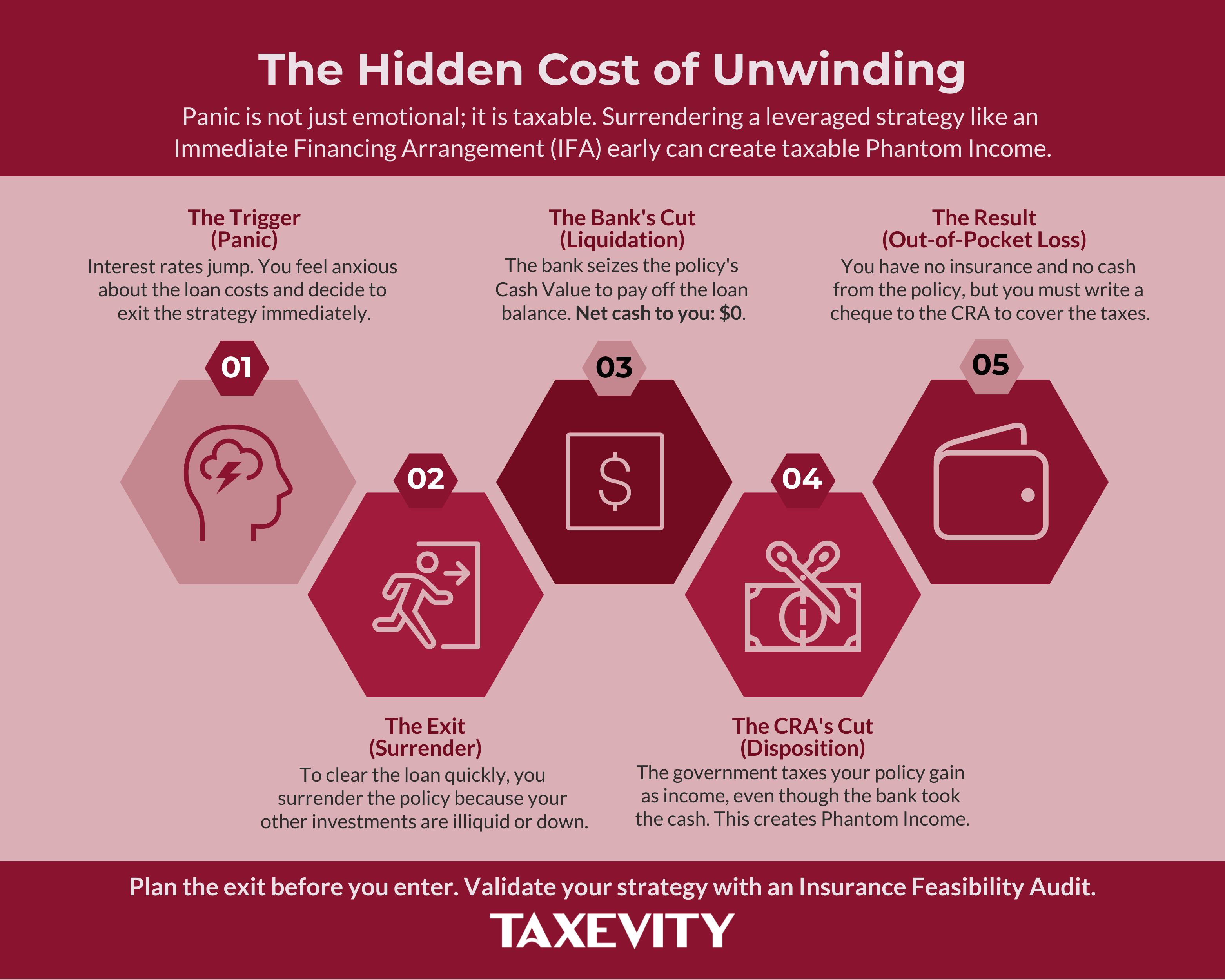 Flowchart titled "The Hidden Cost of Unwinding" showing the 5 steps of a failed strategy: 1. Panic (Trigger), 2. Surrender (due to illiquidity), 3. Bank Liquidation ($0 net cash), 4. CRA Tax (Phantom Income), and 5. Out-of-Pocket Loss.