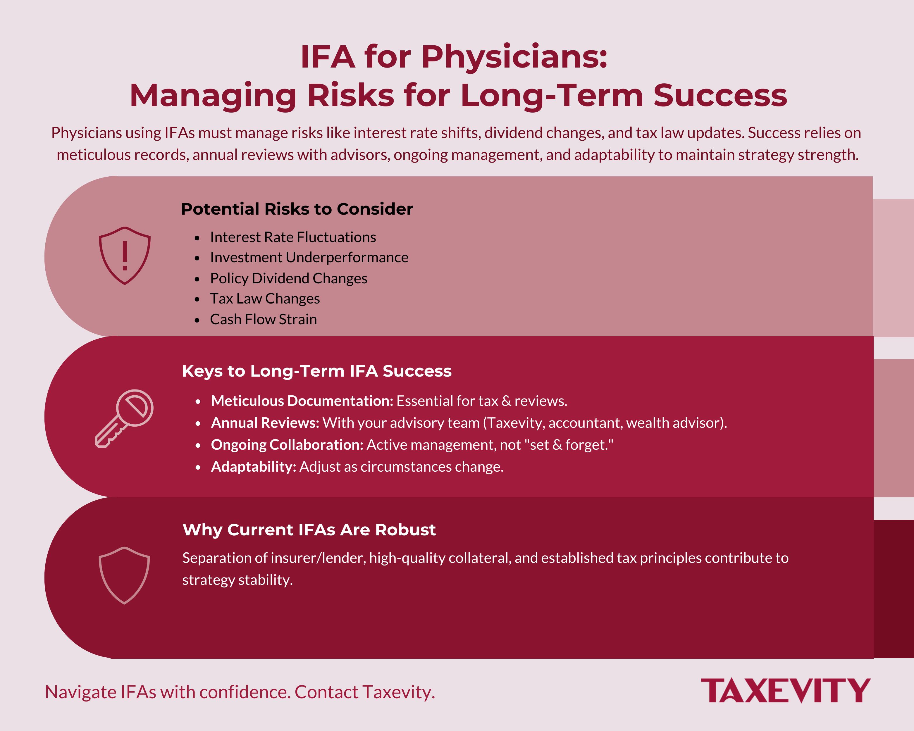 By understanding the risks, leveraging the inherent strengths of the strategy, and committing to diligent ongoing management with the support of experienced advisors like Taxevity, physicians can confidently navigate their IFA and work towards achieving their long-term financial objectives.